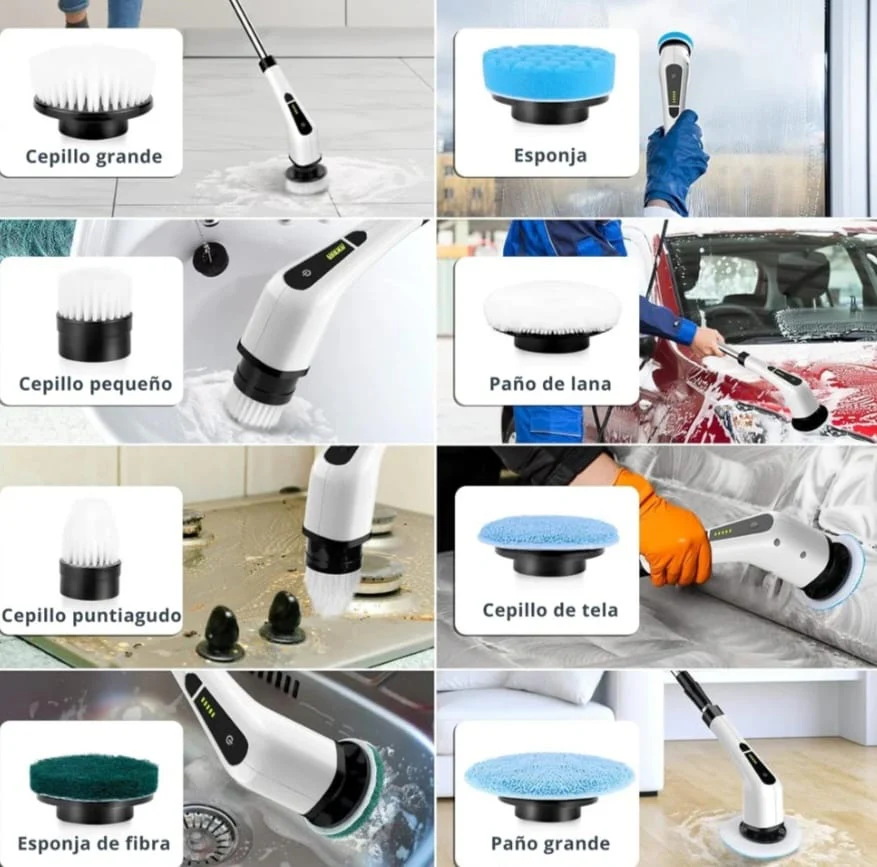 ⚙️ 9 cabezales de limpieza: esponjas, cepillos duros, suaves y especiales.